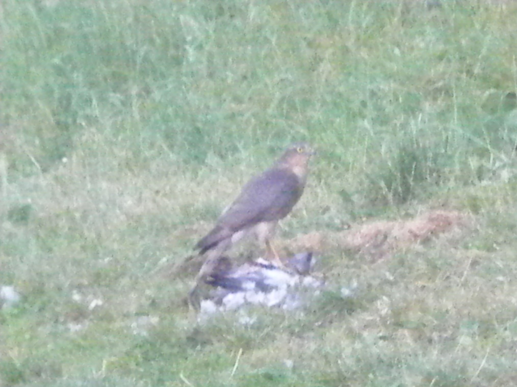 the pidgeon was sufficiently disabled that it no longer fought back. At this point the moorhen wandered off and a kestral, spotting an easy meal, swooped down, settled on the pidgeon and started eating it. Quite gruesome but most interesting and enlightening. Apparently moorhens are a very aggressive bird and intensly territorial.