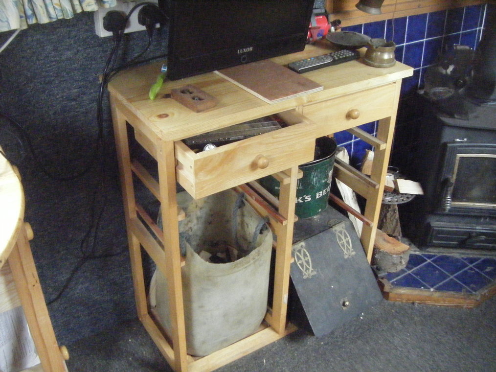 Made the frame and fitted drawers at the sides instead of the back. The frame was made with timber that I had hanging around, the top with the piece that my travelling companion had found and the drawers were made with surplus tounge and groove that Richard no longer wanted. I only had enough wood to make six drawers altogether, three each side but the space at the bottom is ideal to hold the kindling box and a couple of washing up bowls.