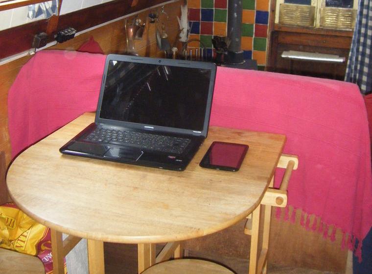 When I was on Almyne I had a small gate leg table with drawers to the opposite side to the folding top. I love it, but when I sold Almyne I let the table go with the boat as I thought that the table I had on Forty Two would suffice. As it turned out that table was just too big for me. After a lot of research I managed to source a new table in the same style as the old one but it was made of MDF and pretty soon was falling to pieces. Eventually I found a replacement, just like the original in a charity shop in Hinckley, which we had to carry through town, get it on the bus and then carry it from the bus stop to the boat, about three quarters of a mile alltogether. Fortunately another boater helped us carry the table along the tow path.