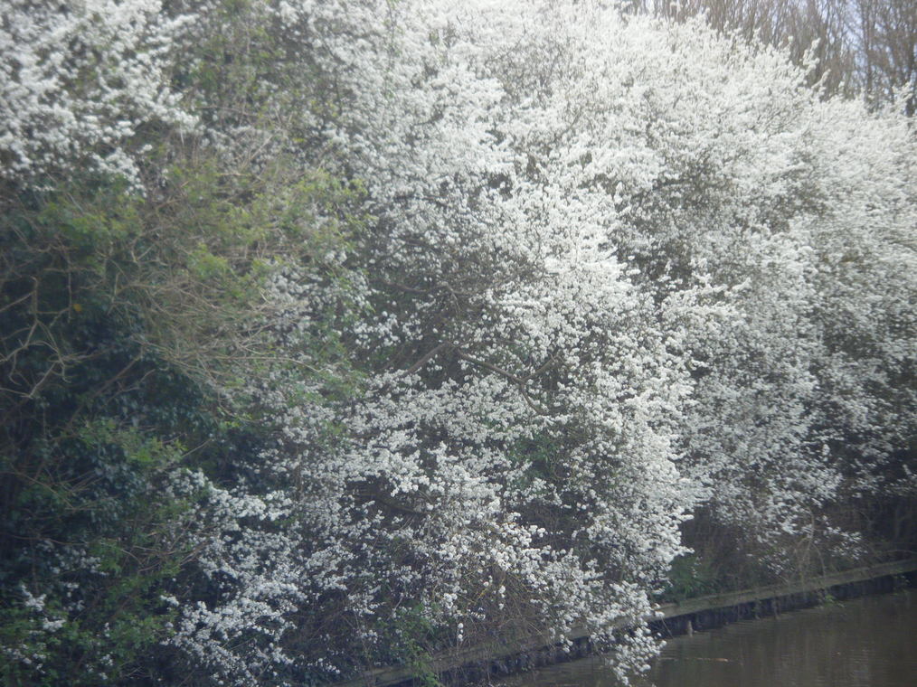 On our way back to Rugby we passed some blackthorn trees just coming into blossom. They are one of the first to produce their flowers and can be so prolific that once the petals drop off the canal can look as if it has a layer or snow or ice on it.